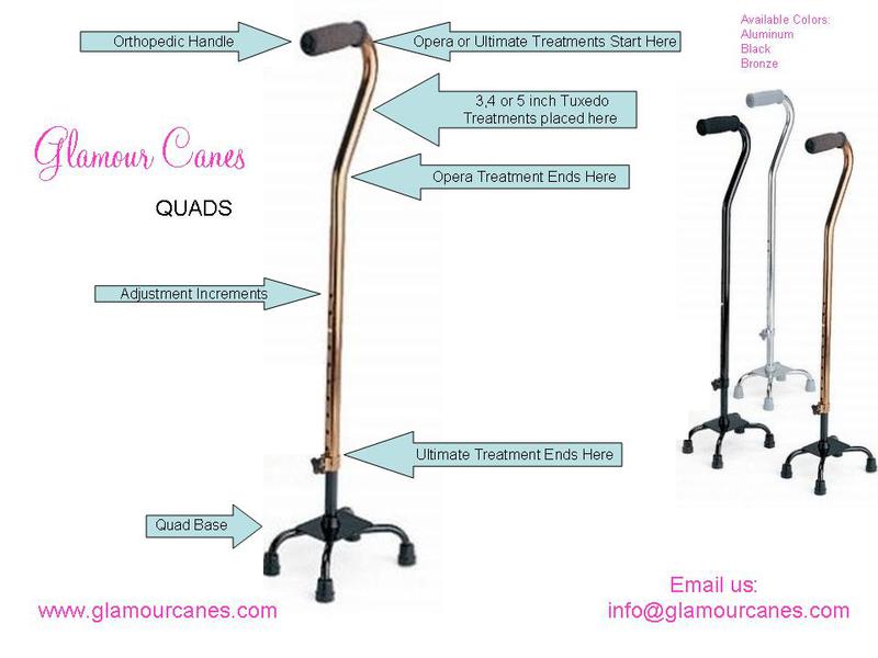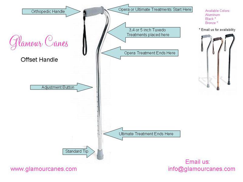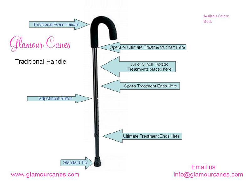 Opera Treatment: Begins at the base of the foam handle and ends at the first adjustment on Traditional canes or the second bend on Quads and Offset.
