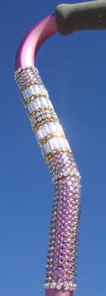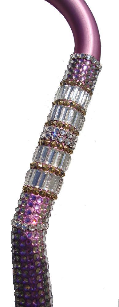 Frills, for the girly-girl! We use 4 types of genuine Swarovski® Premium crystals to create this one of a kind custom Glamour Cane on a pink aluminum offset. The first bend on an offset cane is the most vulnerable - we left this one free of crystals so you can use her every day! Fully adjustable, of course. You'll be enchanted by the changing colors of the Vitrail Light crystals and the unmatched sparkle of the baguettes, mesh and 24-karat gold plated trims. For the woman who knows she's female and isn't afraid to show it!