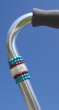 Inspired by sterling silver Southwest jewelry that draws from the abundance of natural gemstones, Glamour Canes has created this Offset style cane with a Southwestern flair. Turquoise (asbl) cabochons layered with natural red jasper cabochons surround a band of Swarovski ® clear pearl mesh. Vulnerable areas of the cane are left free of crystals to ensure lasting effects of these beautiful cabochons. An exclusive design available only from Glamour Canes that can be expanded with additional stones. Request a quote or order as shown.