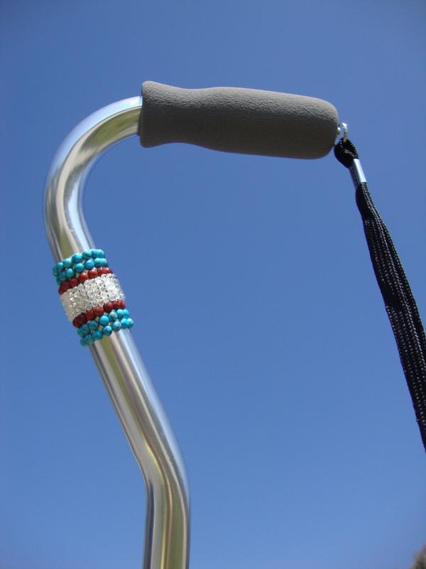 Inspired by sterling silver Southwest jewelry that draws from the abundance of natural gemstones, Glamour Canes has created this Offset style cane with a Southwestern flair. Turquoise (asbl) cabochons layered with natural red jasper cabochons surround a band of Swarovski ® clear pearl mesh. Vulnerable areas of the cane are left free of crystals to ensure lasting effects of these beautiful cabochons. An exclusive design available only from Glamour Canes that can be expanded with additional stones. Request a quote or order as shown.