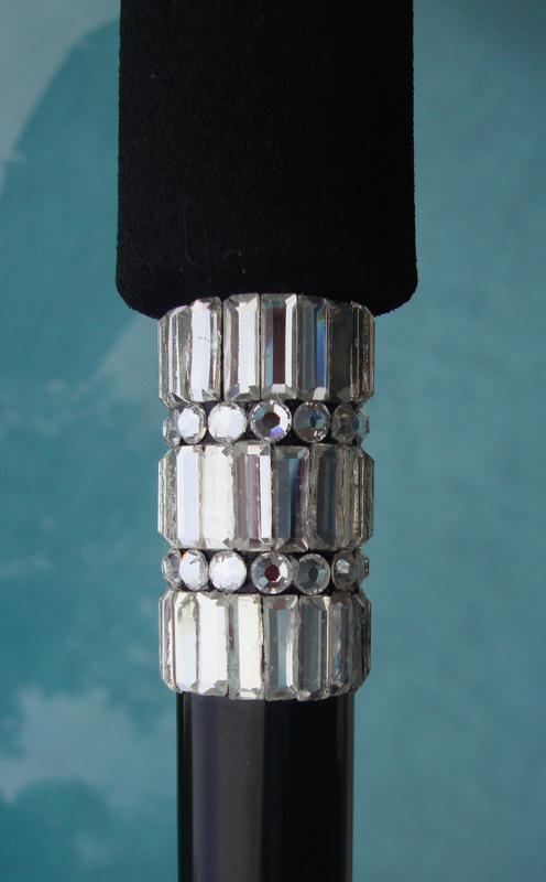 CRYSTAL DEMURE This is the Swarovski® Crystal Mesh equivalent to the Demure custom treatment cane with individually placed crystals. We can make this cane in your choice of crystal mesh: pearl mesh with your choice of top and bottom colors, a band of small crystals as shown, or three rows large crystal mesh and top and bottom rows in your color choice. On this cane we placed a band of small clear Crystal Mesh just below the handle - and finished it with a row of Jet crystals. it can also be placed lower on the cane shaft if you prefer. On the Offset style, we can place the band of mesh at your direction between the two bends.